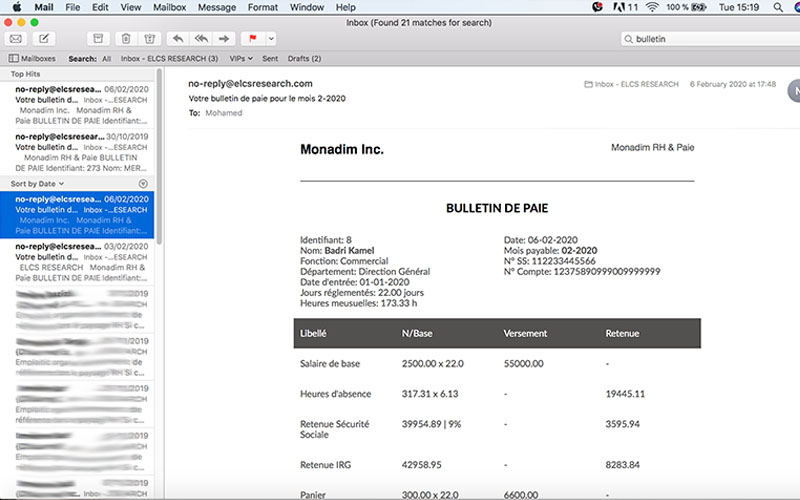 En un seul clique, tous vos collaborateurs receverons leur bulletin de paie par mail et en format html! comme vous pouvez envoyer les bulletin à une liste définit ou bien à un seul collaborateur seulement. A vrai dire vous n'avez qu'à imaginer le scénario, Monadim fait le reste.